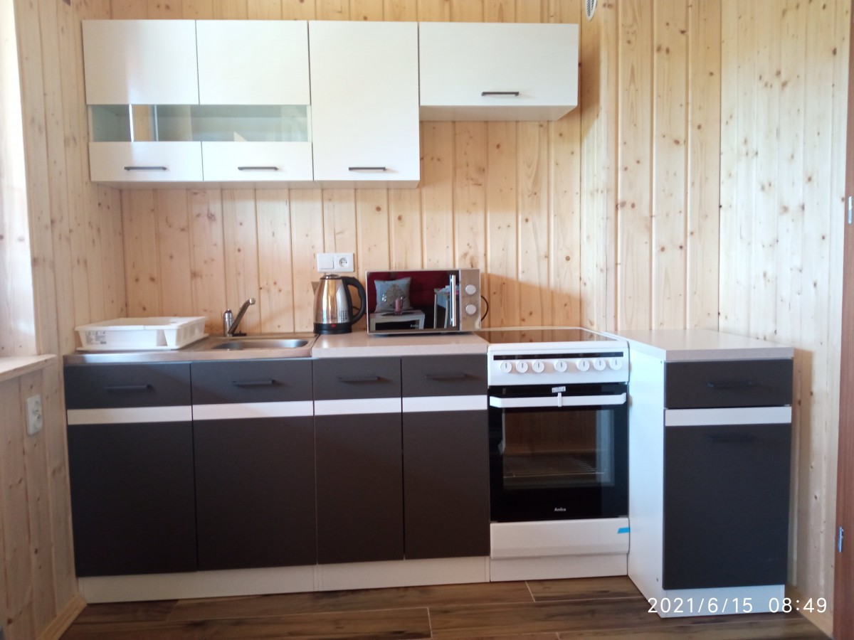 dobrze wyposażony aneks kuchenny (mikrofalówka, płyta grzewcza, piekarnik, przybory kuchenne, talerze, szklanki, kubki, garnki)